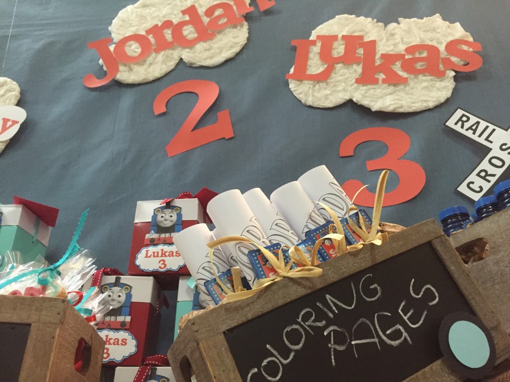 Favor table displayed an idea of the natural location of the rails road on one side whereas the other side was decorated as landscape,We can also find elements of the the train conductor, as well as the train station. A perfect blend of Choo Choo Train and train conductor customs.Sweet table was finely decorated with Party favors customized boxes, coloring pages bubbles were beautifully placed on either side of the table. The stationary and printable were too adorable and cute!. everything was custom made just for these two beautiful children. I was pleasure all with a vintage style, giving a sense of antique, simple and at the same time contemporary