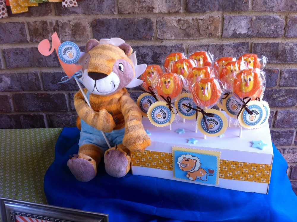Gorgeous cake, cute party favors and adorable lion chocolate lollipops!